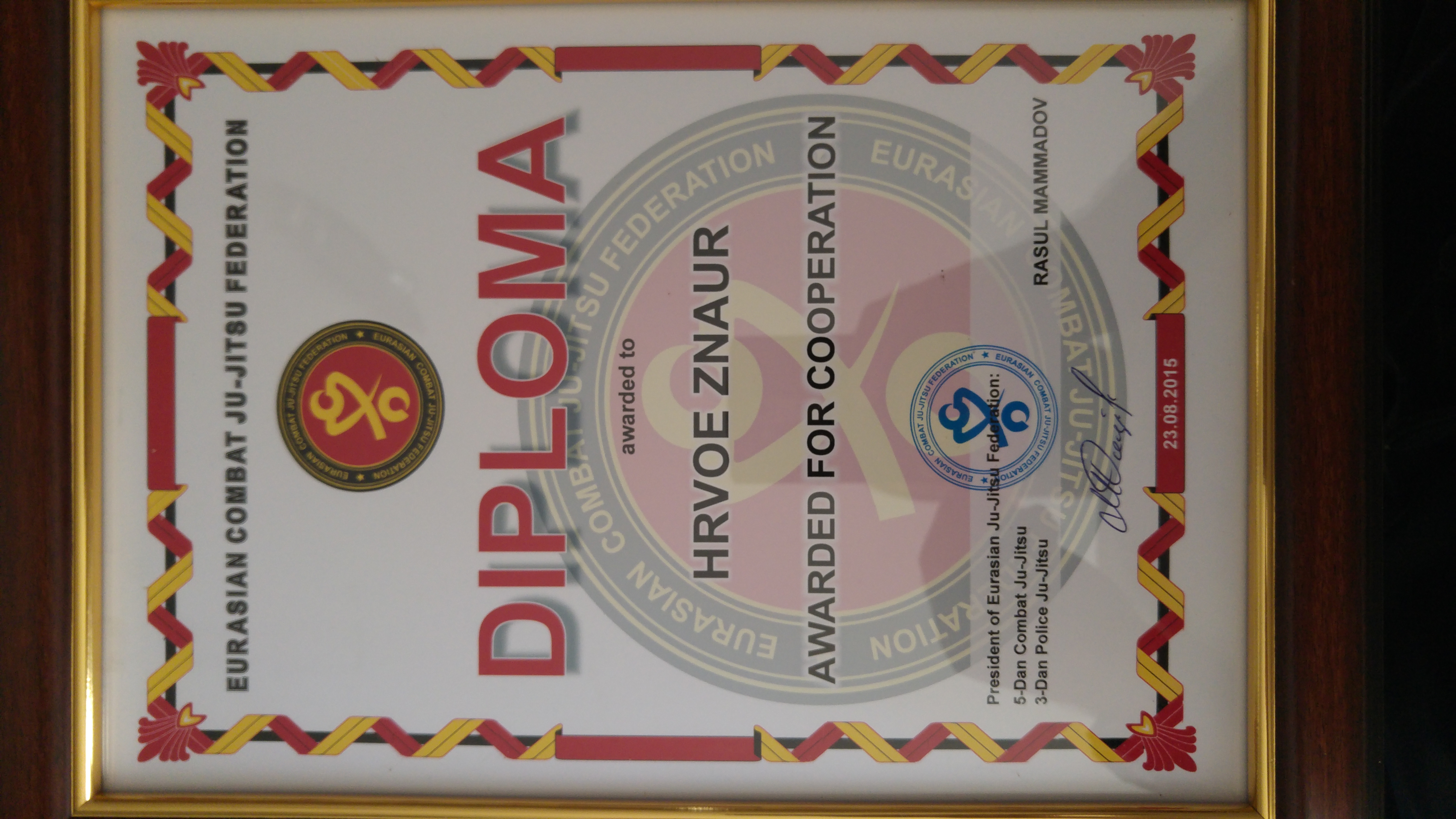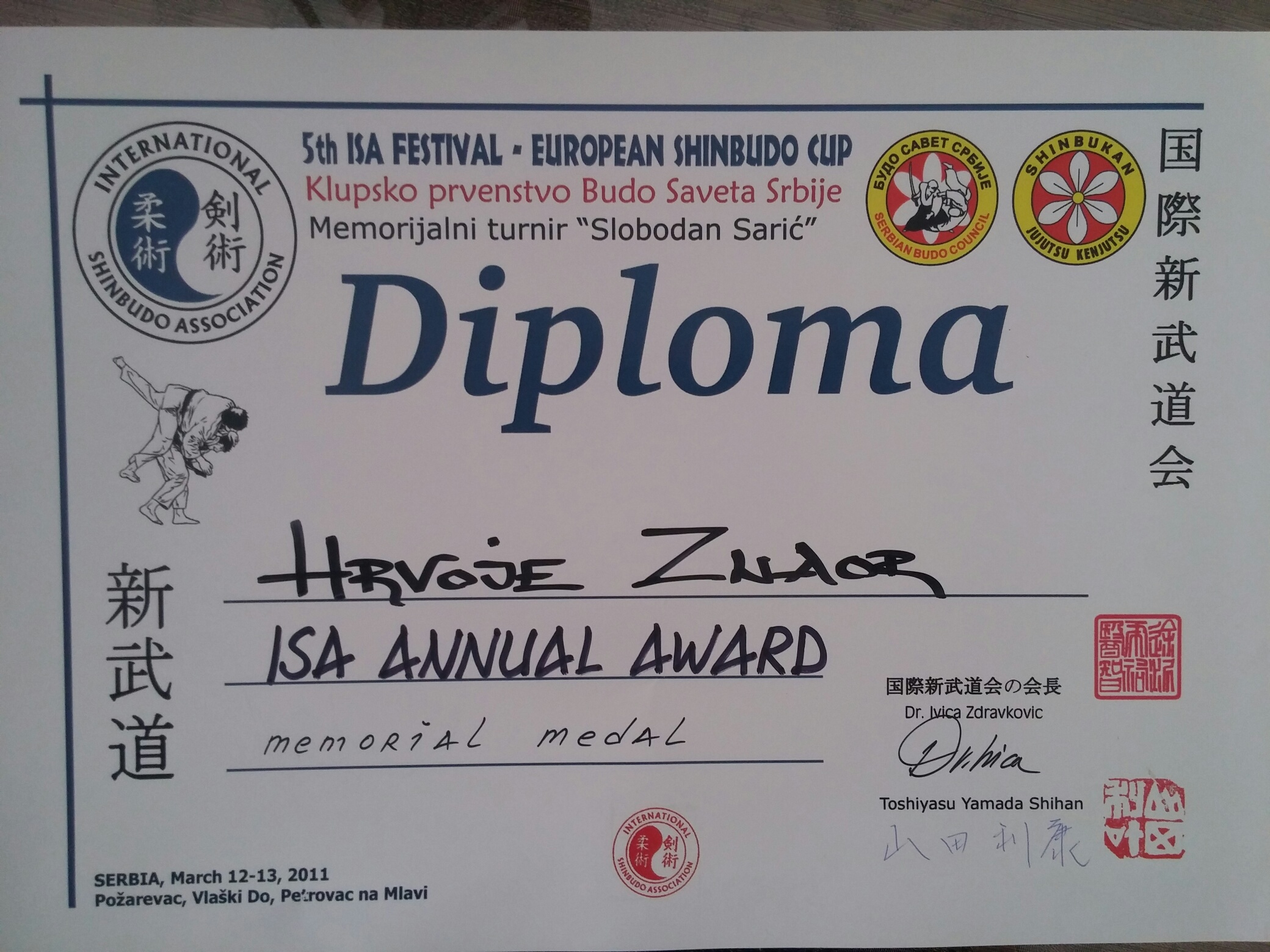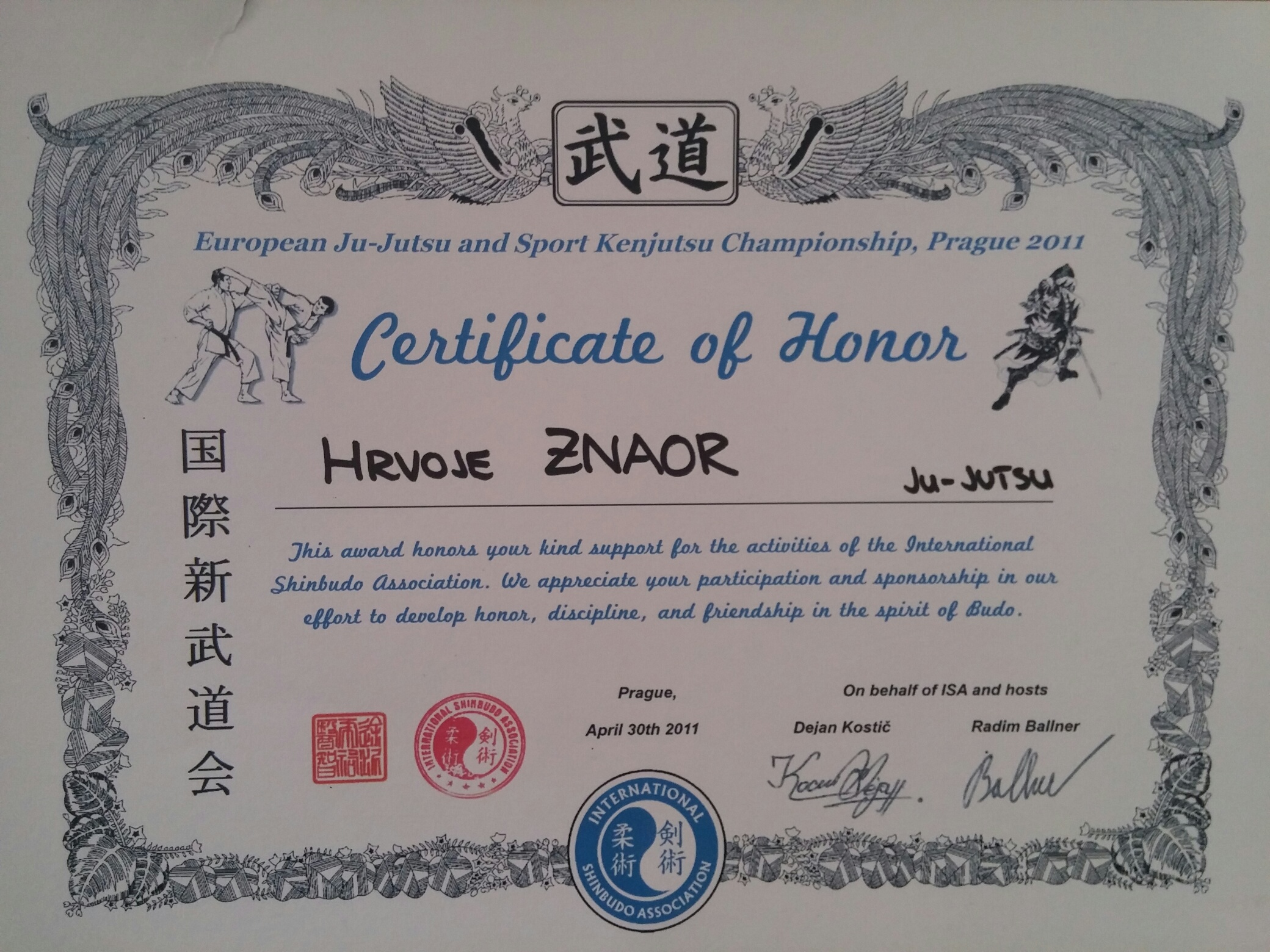 trener Hrvoje Znaor je nagrađen posebnim priznanjem Svjetske combat jitsu federacije za 30 godina borilačke karijere u kojoj je ostvario zavidne rezultate kao borac, trener i promotor borilačkih vještina.